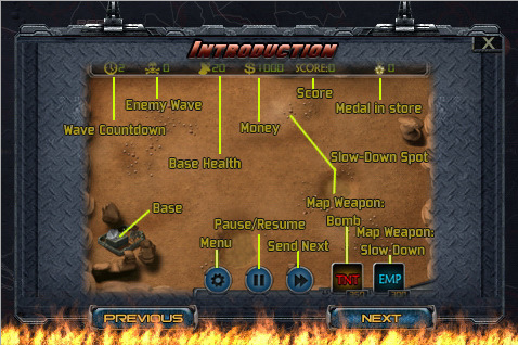 一開始先介紹此款遊戲的操作介面如下,上方欄位是一些資訊,像是距離下一波的時間、入侵波數、主堡血量、金錢、分數、勳章數...等。下方則是遊戲進行的相關設定,像是主選單、暫停遊戲、遊戲速度...等。遊戲進行過程中會非常緊湊,但是還是要養成看儀表資訊的習慣,才能知道下一步該怎麼做比較好喔!