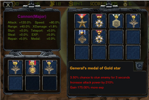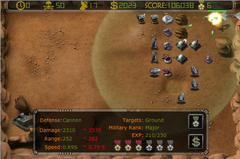接者,這遊戲最大的特色是箭塔也是有官階的喔!當你不斷的打倒敵人後就可以拿到許多官階徽章,此時只要按住箭塔,再選擇徽章按鈕,就可以出現下方畫面,只需要把右邊倉庫的官階,拖移到左方箭塔的空格中,就可以順利把箭塔升級嚕!