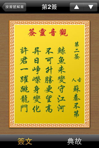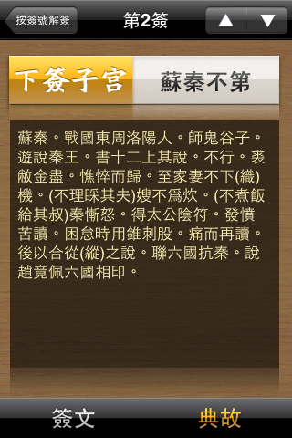 解籤的畫面有兩個,第一個是「簽文」,就是我們一般看到的籤詩,今天我抽到的是「蘇秦不第」籤。看了籤詩之後,若還是不懂裡面的意思,沒關係,可以按一下右下角的「典故」按鍵,去了解一下此籤詩的故事。
