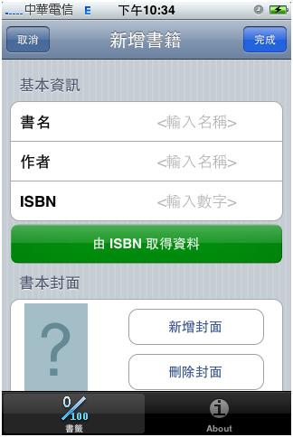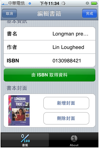 由於每本書籍的資訊都記錄在ISBN當中,因此您也可以直接先Key入ISBN的資訊,然後按下「由ISBN取得資料」按鍵來搜尋書籍資訊。如下圖所示,搜尋完畢之後,不但會出現書名、作者名稱,甚至還可以自己幫您抓到封面的圖片喔!