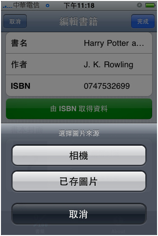 此時,您可透過「新增封面」這個功能來自行新增書本圖片。按下此按鍵之後,您可選擇從圖庫選取照片,或是直接幫書籍拍下封面照片的方式來新增書本封面。在此我們選取相機功能來新增書籍封面。
