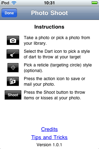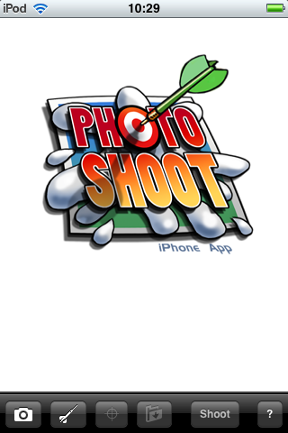 操作方法非常的簡單,所有的功能鍵都在畫面的下方,由左到右分別是選圖、挑選箭的款式、選箭靶款式、儲存照片、射箭,和操作方式教學。