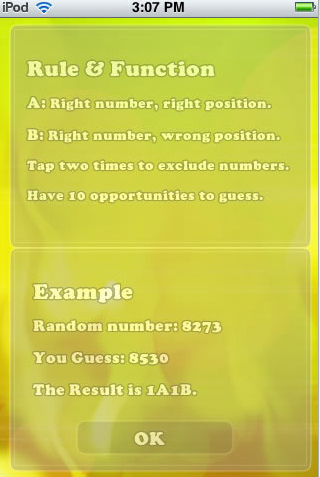 以下為遊戲簡介說明,在此用中文簡單跟大家介紹一下遊戲規則,剛開始時,先隨便猜四個數字,猜完之後就會出現 OAOB的字樣,A的意思代表:數字與位置都正確;B的意思代表:數字正確,但位置不對,舉例來說: