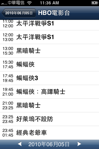 選好日期後再進入各頻道就可以預先看到當天的節目表囉 (HBO這週六有黑暗騎士耶!