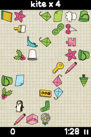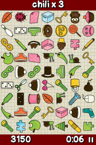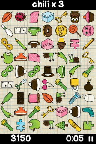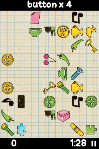 本來筆者以為這玩法玩起來應該滿簡單的,不過事實上由於物品都是塗鴉風,而且還經常跟自己想像中的顏色不一樣(例如花不是紅色的Orz),還有同一個物品也會有不同的顏色喔(例如下圖中的鈕扣有綠也有黃),因此真的要張大你的雙眼展開地毯式搜索XD