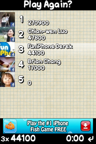 登入後和剛剛一樣按Play鍵開始遊戲,玩法也一樣,差別在於遊戲結束後可以和自己Facebook上的朋友比較分數XD