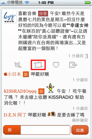 3. 轉噗:逛撲浪時,經常可以看到許多新奇有趣的事物,忍不住想分享給更多朋友,此時只要按下「轉噗」鍵(如下左圖所示),就可以將看到的噗浪內容,轉貼到自己的河道上囉~