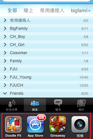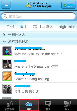 而【朋友】的功能列裡可看到所有的連絡人,當然也能選擇想要開啟的群組或是只顯示在線上的連絡人。只要在連絡人的名字上點一下,就可以跟對方聊天囉^__^ (就算朋友離線也可以敲他喔XD)