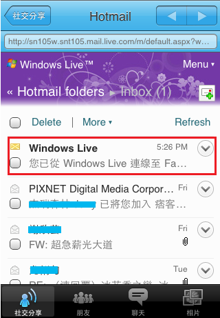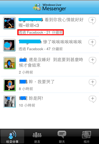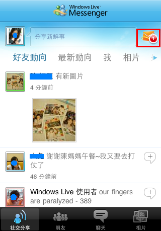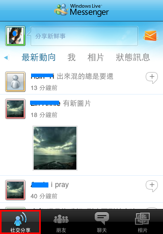 登入MSN之後,下方的功能列有社交分享、朋友、聊天以及相片。在【社交分享】裡,可以看到MSN連絡人的最新動向哦!讓我們可以隨時掌握朋友們的最新資訊。