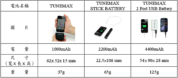 最後是電量1000mAh的「TUNEMAX」,也就是體積最小的直接外接式電池