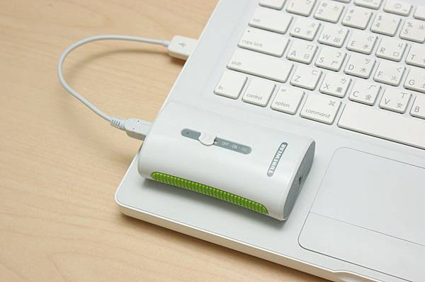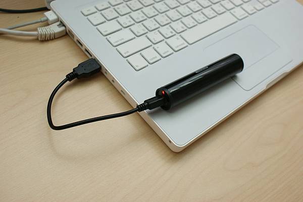 電池本身要充電也非常簡單,利用附贈的連接線接上電腦的USB孔即可~(尚未充飽前會亮橘燈)