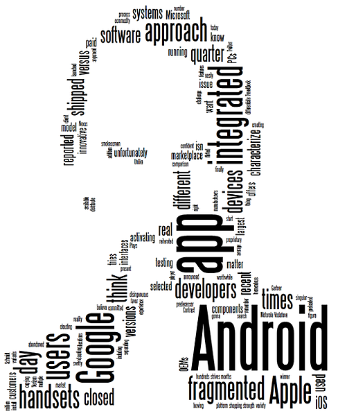 下圖據說是根據賈伯斯最常提到的關鍵字所做出來的,字體越大代表越常提到 (恩...好大的Android)