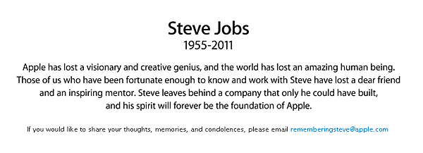 首圖和下圖是今天一早Apple官網更新的照片以及悼詞。蘋果迷們若有想說的話,無論是對賈伯斯的追憶或慰問,都可以寄到以下Email (蘋果官方提供):rememberingsteve@apple.com