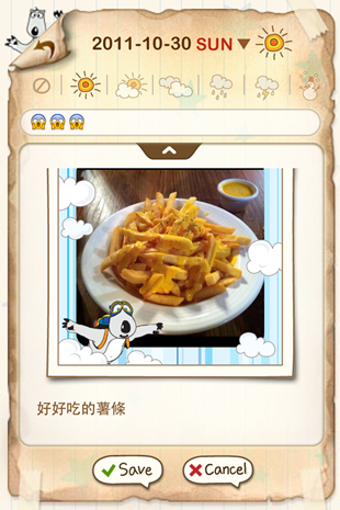 在寫日記的時候還可以加入照片,而照片也可以做編輯,加入邊框或編輯