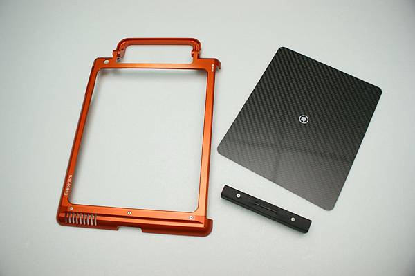 下面就是今天開箱的主角,由左到右分別是「Esoterism Moat貳 iPad 2 多功能鋁合金保護框」和贈送的「碳纖維背貼」