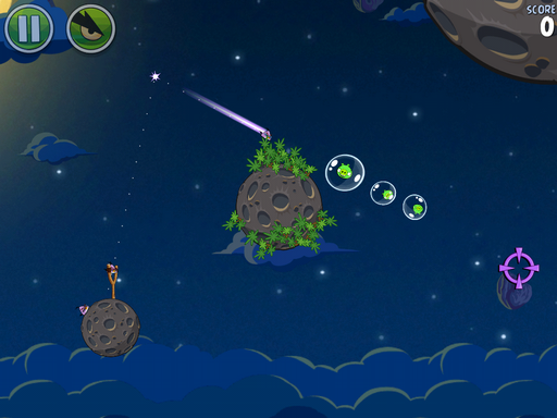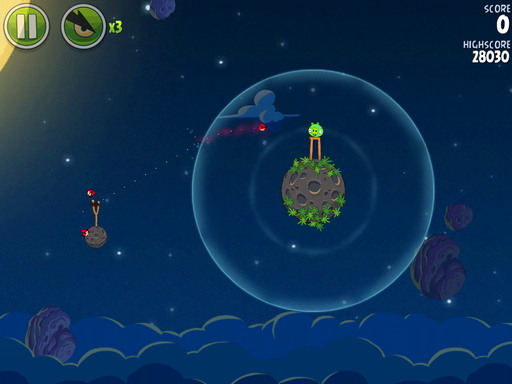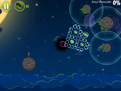 在外太空,想當然是無重力,所以小鳥們會呈直線飛行狀態,只要一進入星球的引力範圍小鳥們才會以拋物線方向飛行喔