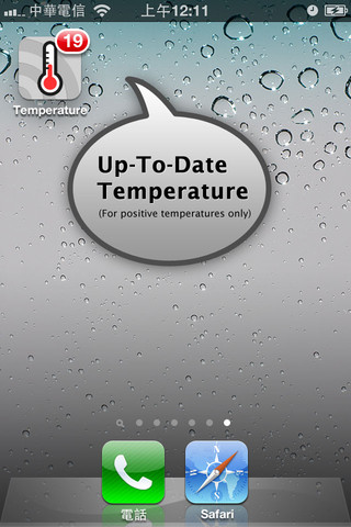 這個程式真的很好用,上次筆者限免已經下載囉!朋友們可別錯過,大家很想出門之前馬上看幾度,但是又不想要一直滑動手指,大家只要下載後,就可以看到可愛的ICON上顯示著溫度喔!以後可以即時看到外面的溫度,不用怕著涼囉!