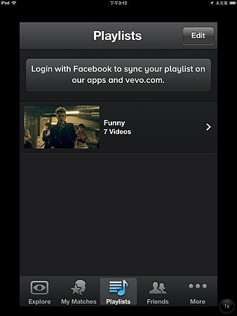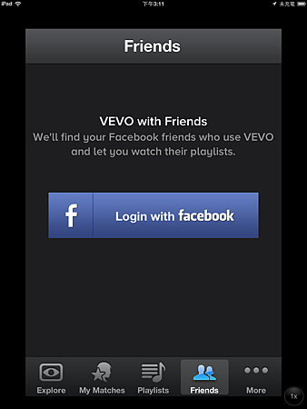 若iOS裝置中的iTunes裡面有購買歌曲,VEVO也會根據我們的音樂喜好,推薦更多音樂給我們。也可連結到臉書,去瞧瞧兒朋友們聽些什麼稀奇古怪好音樂?