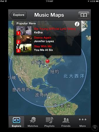 若是好奇,在全世界各地大家都聽些什麼? 那就用地區流行的方式查找。不過目前若定位在台灣,就不會有足夠的資料顯示;因此小編將定位定於多倫多附近,馬上就看到Ke$ha很受到當地人歡迎~![]()
