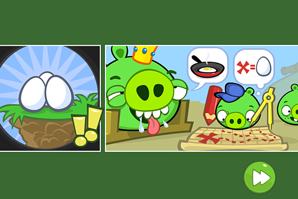 進入每個大關卡後都會有主題的漫畫,綠豬國王想要吃蛋,下屬們正在計畫路線去奪取,與Angry Bird的故事相呼應。